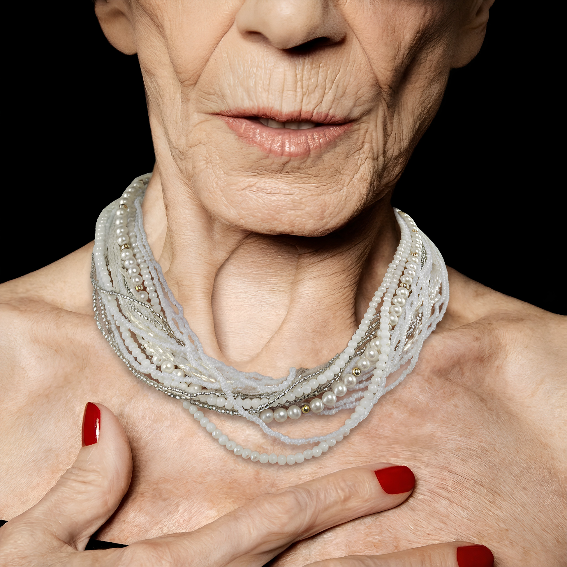 Un intreccio di microperline nere, perle avorio e un cabochon centrale incorniciato da strass. Questa collana anni ’80 è fatta per chi ama sovrapporre, mixare, esagerare. Struttura morbida, carattere deciso.