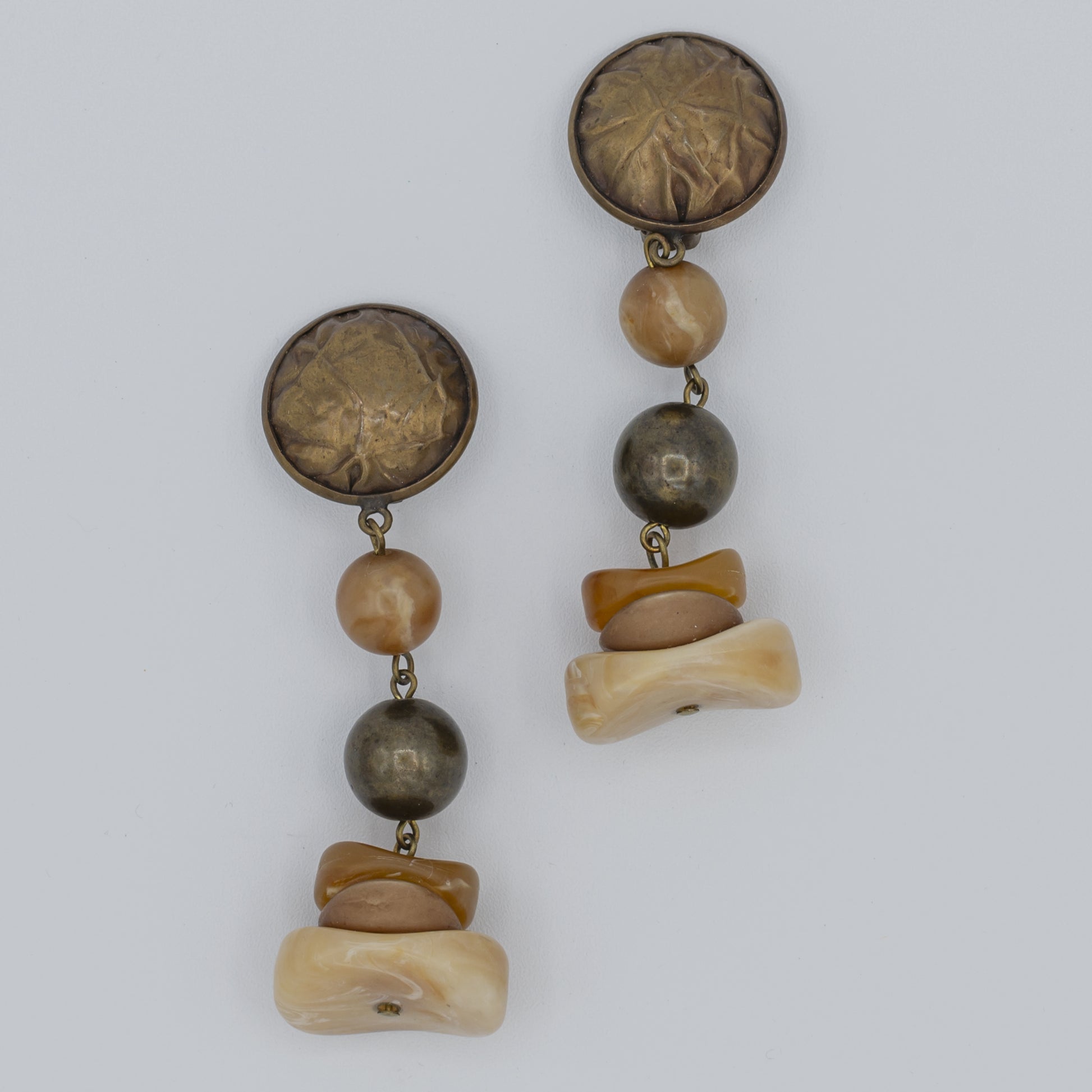 Orecchini vintage dal fascino naturale e artigianale, con base rotonda in metallo brunito decorata e pendenti multipli di perle e pietre in tonalità calde e terrose.