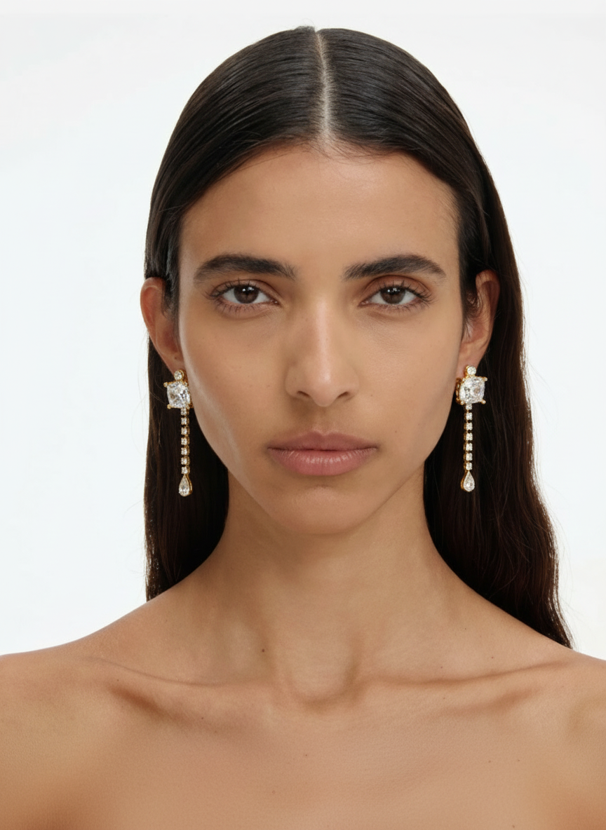 Questi orecchini vintage in metallo dorato e cristalli trasparenti uniscono luce e struttura: una maxi pietra centrale sfaccettata si lega a una fila lineare di strass incastonati, chiusa da una goccia luminosa.
