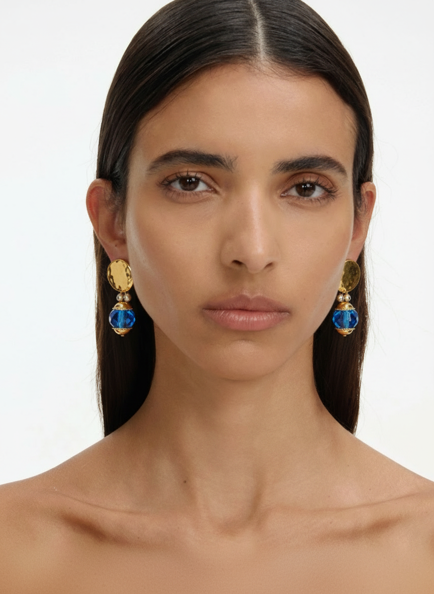 Una cupola dorata, un cristallo ambrato intenso, perle e sfere in equilibrio precario. Questi orecchini anni ’90 sembrano fatti per il golden hour. Bold, vibranti, sensuali.