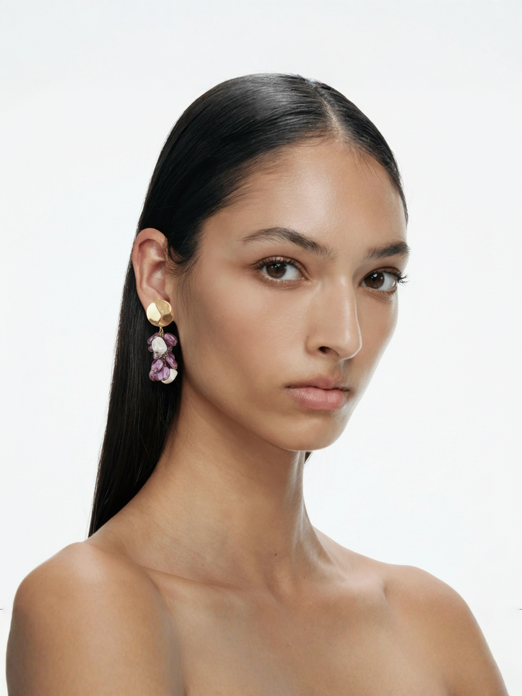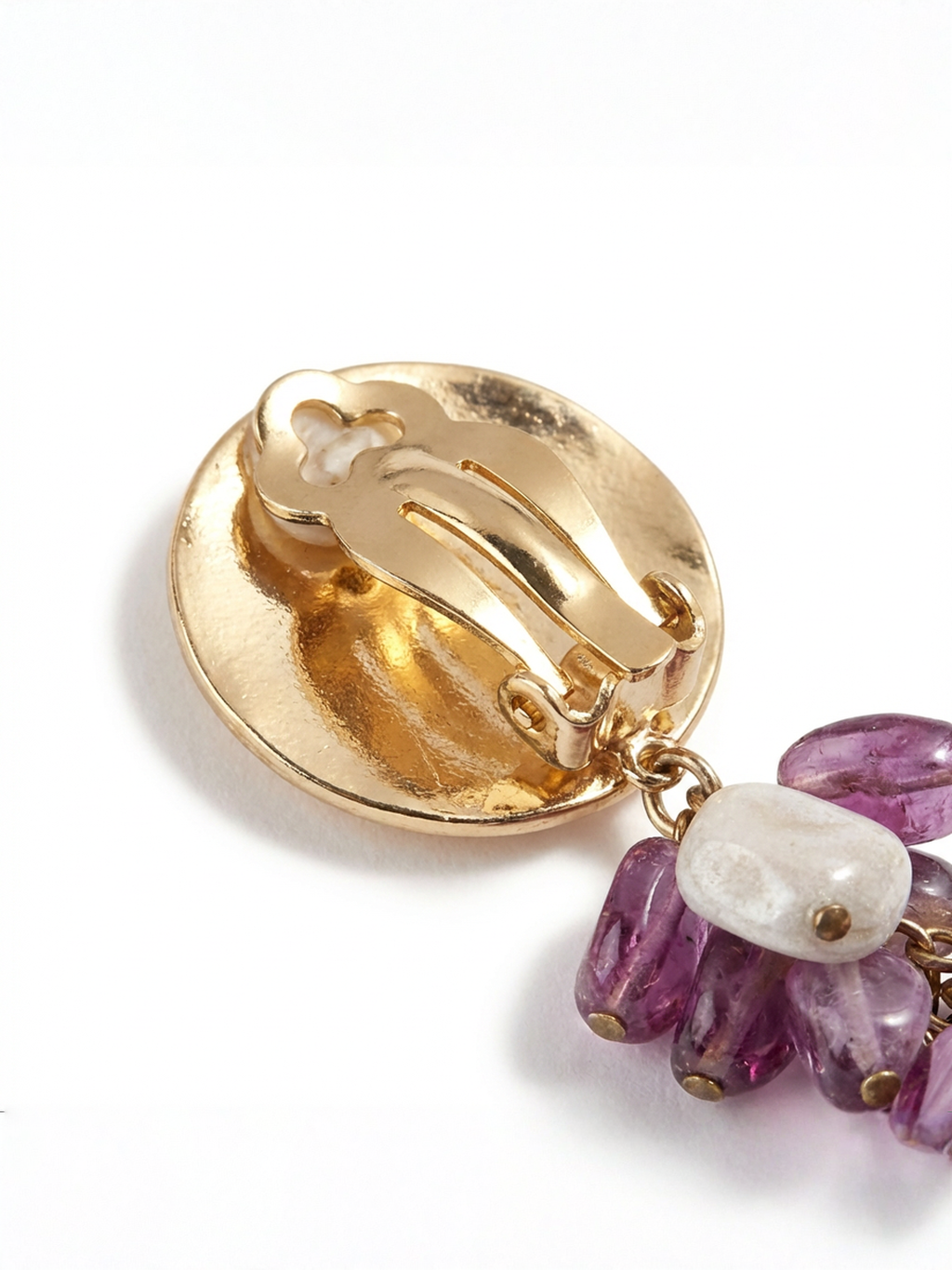 Orecchini vintage che parlano di luce e femminilità. La base dorata sfaccettata cattura lo sguardo, mentre i pendenti di cristalli viola e perle irregolari raccontano storie di dettagli unici.