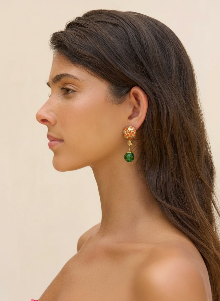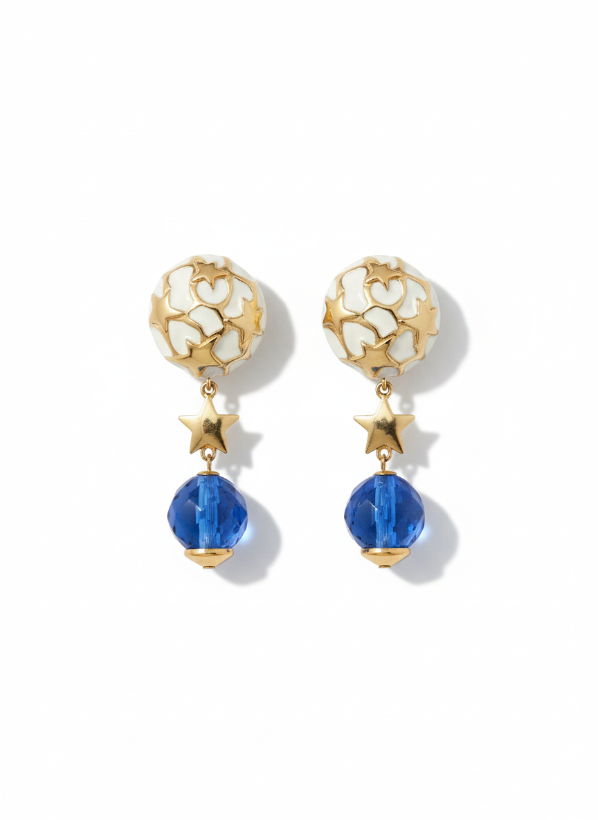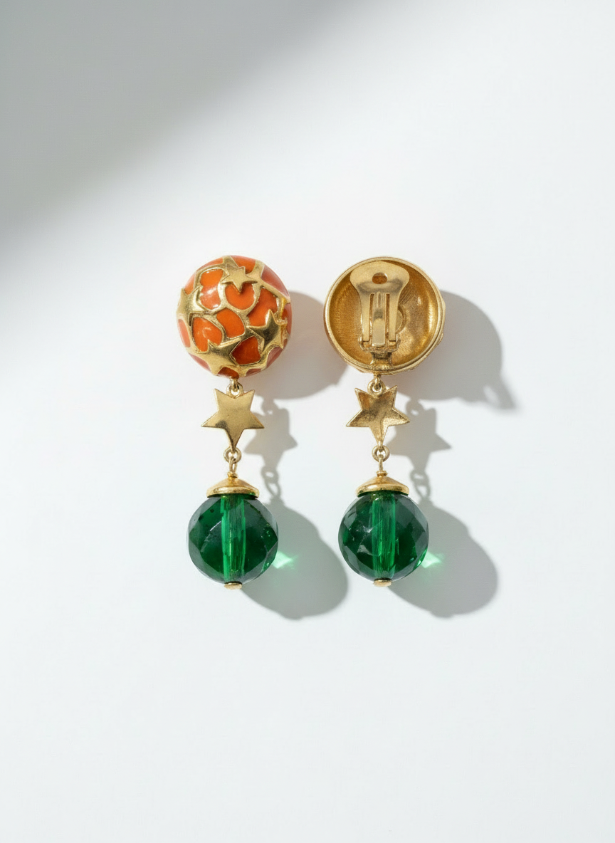 Un cielo punteggiato di stelle dorate. Un pendente che ondeggia come un pensiero leggero. Questi orecchini Valentino anni ’90 sembrano usciti da una favola, ma hanno la forza di chi ama essere guardata. Rari, teneri, irresistibili.