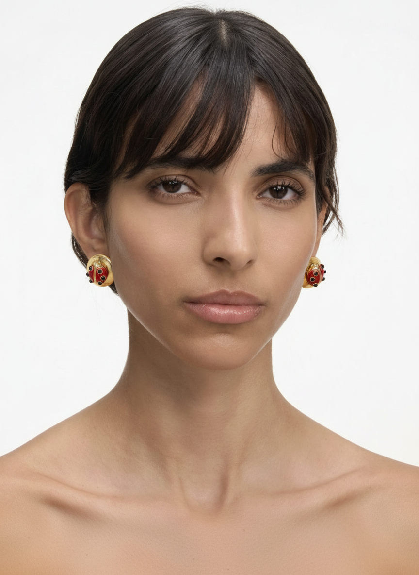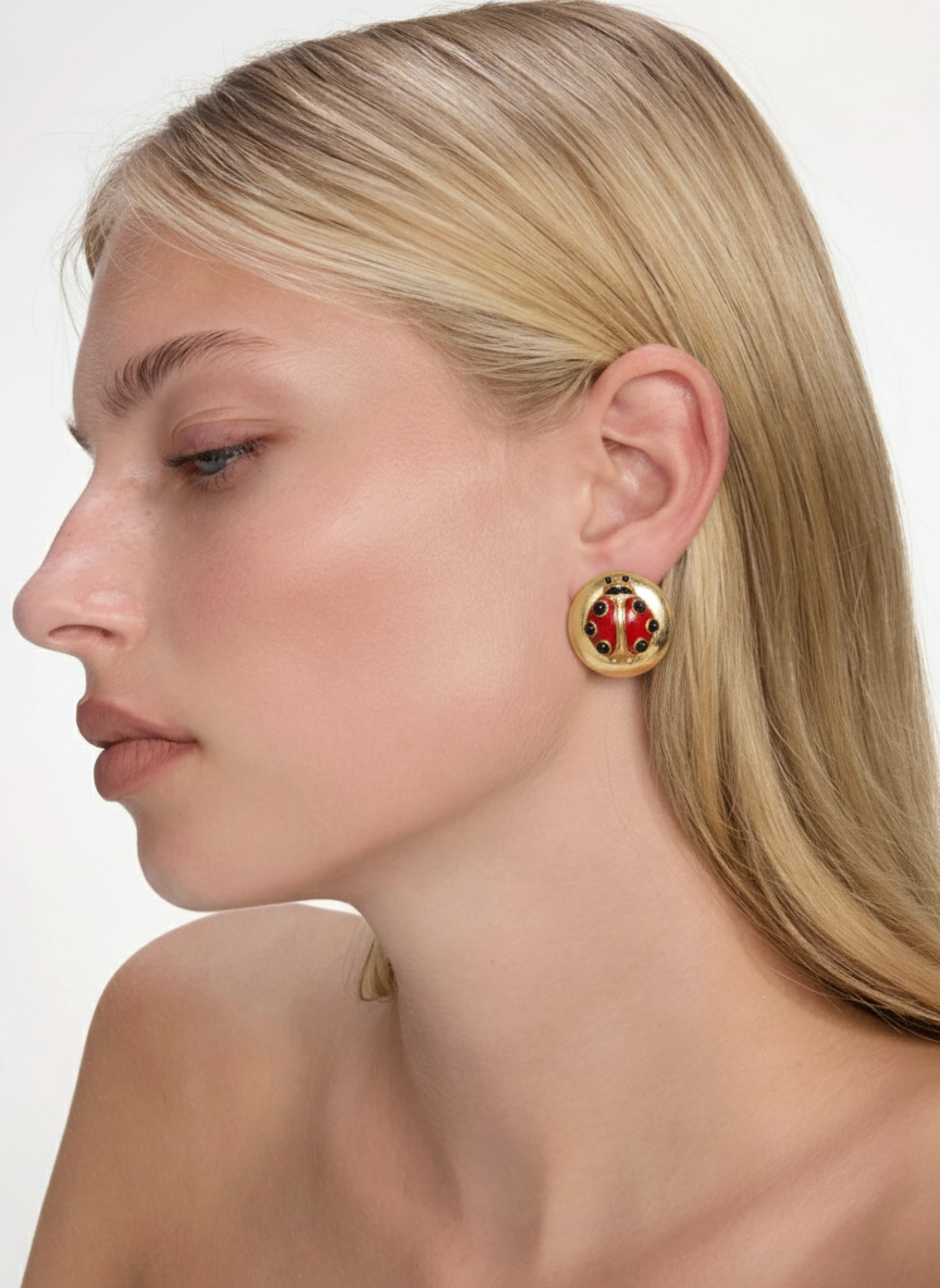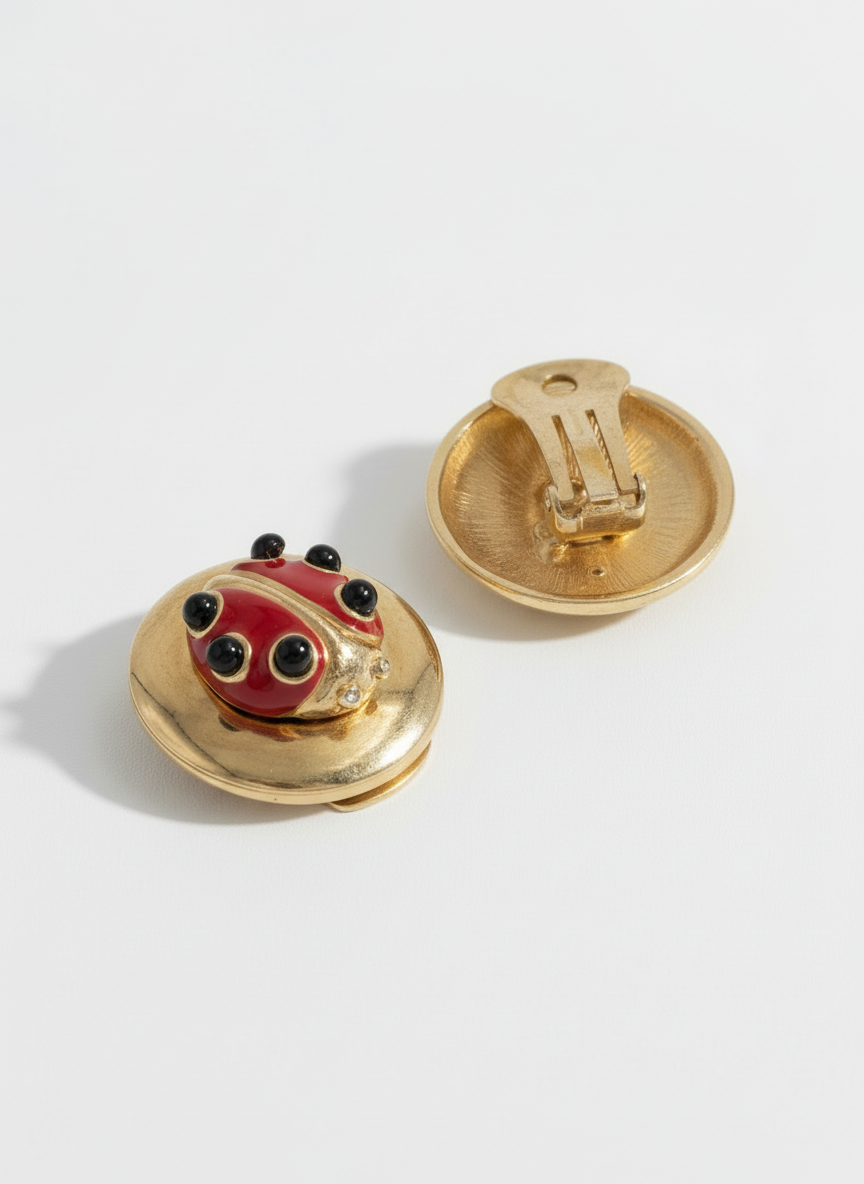 Un bottone dorato che accoglie una coccinella smaltata rosso fuoco. Questi orecchini Valentino anni ’90 mischiano ironia e classe in un gesto solo.